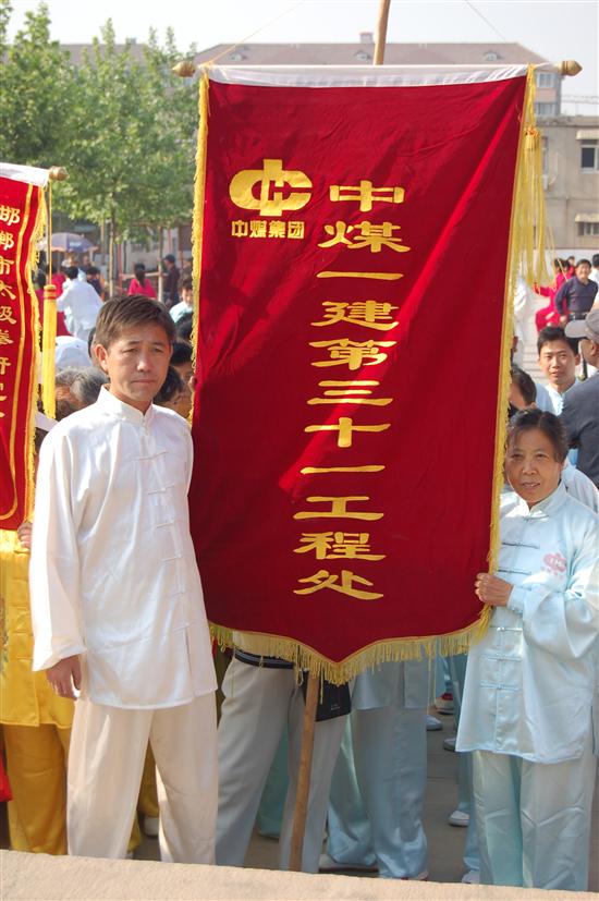 本网讯 (通讯员:李文锋/何红宇)以庆祝建国60周年为主题的“邯郸市第九届太极文化节”于5月7日上午在邯郸市复兴区大乘寺广场举行,邯郸市政协副主席贾红军、市体育局局长曹淑霞、市仲裁委主任燕振科等领导以及社会各团体领导在前排就座。中煤一建31处太极拳代表队应邀参加了表演。