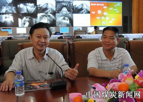 李总编在塘内煤矿调度指挥中心观看自动化生产线运行情况(右为右江矿务局局长叶仿拥)。