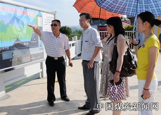 右江矿务局局长叶仿拥(左)向李总编一行介绍矿井污水治理情况。