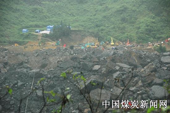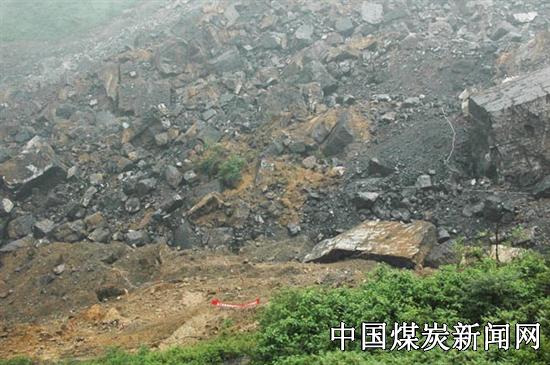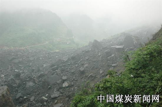 ![]() 崩岩滑坡现场鸟瞰。(红色处为能源集团抢险标语)