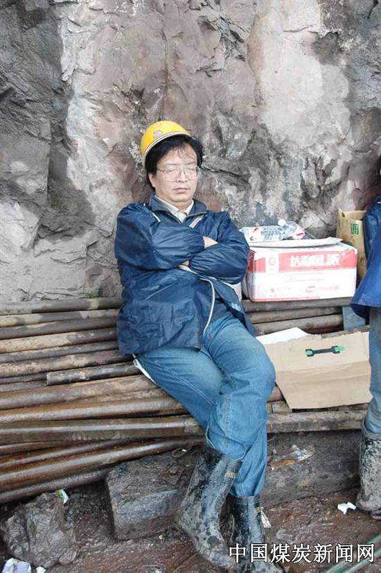![]() 工作间隙,坐在钻杆上抓紧打一个盹的钻探施工人员