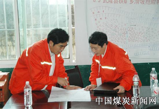![]() 能源集团副总经理张凤舞(左)正在与地质技术人员讨论救灾方案