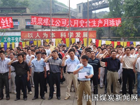 日,川煤集团芙蓉珙泉煤业公司举行六月安全月系列活动,干部职工面对国旗、公司旗和安全旗,举起右手庄严宣誓。围绕“关爱生命、安全发展”活动主题,该公司还将开展安全咨询、安全游园、送温暖、救护比武、案例分析会、安全歌咏比赛和查岗系统活动。