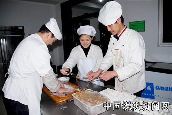 )进入6月份以来,阳煤五矿针对夏季炎热食品不易管理的特点,大力开展生活后勤优质服务活动,加强食品卫生管理,提高职工饭菜质量,适当调节饭菜花样,尽量满足职工要求。特别是强化班中餐管理,严格加强食品消毒,认真检查食品和蔬菜质量,严把采购关,确保下井职工吃班中餐放心,喝鸡蛋汤开心,岗位上干活舒心。图为班中餐的炊事员为井下职工包饺子。