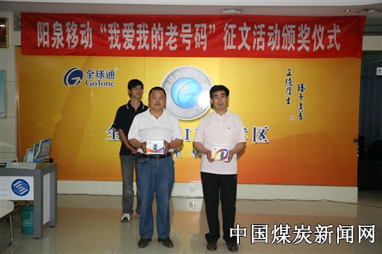 特约记者胡九潭报道:近日,在中国移动阳泉分公司主办的“我爱我的老号码”征文大赛中,本网特约记者、阳煤五矿选煤厂员工白俊明荣获二等奖,并获得价值1500元的三星手机一部。 由中国移动阳泉分公司主办的“我爱我的老号码”征文大赛,自4月15日启动以来,一个多月内共收到阳泉移动客户投稿568份,评选出一至三等奖9人,纪念奖100人。广大投稿客户通过小小说、故事、散文、诗歌等多种形式,讲述了自己以及身边亲朋好友与移动老号码的故事,反映了移动老号码给工作、生活、社会带来的深刻影响,也表达了阳泉移动客户对移动老号码的真挚情谊。阳煤五矿选煤厂员工白俊明以一篇《最恋我的老号码》从众多稿件中脱颖而出喜获二等奖。 图片中前排左为白俊明本人