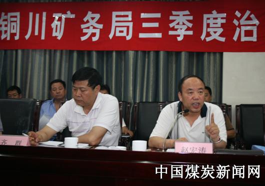 7月10日下午,铜川矿务局召开全局三季度治安稳定工作会议,动员全局上下,统一思想,提高认识,紧抓重点,加强矿区治安防范,广泛开展综合治理,以安全稳定的环境和良好的秩序迎接建国60周年。局党委副书记、纪委书记张志文、副局长郭宝辉,铜川市公安局虹桥分局局长赵宏涛出席会议并作重要讲话,局保卫处、信访处、党委办公室、局办公室、组织部、干部处、资产办、劳社处、企改处等有关处室,基层各单位党委副书记及保卫科、信访办等科室负责人近60人参加了会议。图为会议剪影。 1、会议现场 ![]() 2、局党委副书记、纪委书记张志文(中)、副局长郭宝辉(左)出席会议并作重要讲话 ![]() 3、,铜川市公安局虹桥分局局长赵宏涛(右)出席会议并作重要讲话 ![]() ( 刘孝文摄影报道)