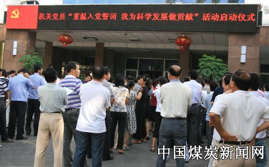 本网讯(本网特约记者 刘孝文/摄影 通讯员 唐雪艳)7月14日上午8时许,铜川矿务局机关全体党员在机关大院举行“重温入党誓词、我为科学发展做贡献"主题实践教育活动启动仪式。铜川矿务局党政主要领导杜树山、宋志刚、李志科、张志文、张仿文、薛鸣、郭宝辉、封建利等与机关全体党员一起,面对鲜红的党旗,庄严地举起右手,宣读了入党誓词。