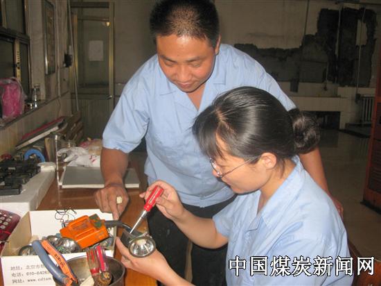 图为该矿职工正将损坏矿灯上完好的配件组装成新矿灯