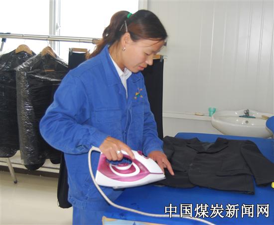 图为该公司洗衣房服务人员正在为职工免费熨烫衣服。