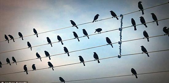 ![]() 鸟群栖息在五条电线上,形似“五线谱”音符