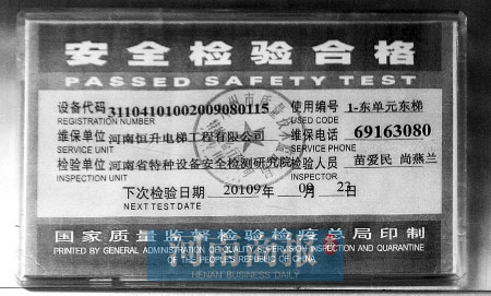 昨日下午,记者在该小区看到这部电梯内,贴有一张“雷人”的河南省特种设备安全检测研究院颁发的安全检验合格证。上面显示,使用编号为“1-东单元东梯”,维保单位为“河南恒生电梯工程有限公司”。检验单位为“河南省特种设备安全检测研究院”,检验人员为:苗爱民、尚燕兰。最下面一行的下次检验日期上写着“20109年09月23日”。