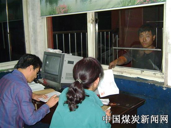 本网讯 9月20日晚19:00,阳煤集团五矿选煤厂门房岗位工潘爱芳(右)正在将填写好的运煤管理票据交到拉煤司机的手中。