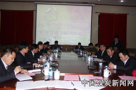 本网讯: 1月22日晚19:30,广西有江矿务塘局内煤矿党委在矿调度指挥中心召开了领导班子民主生活会。矿领导班子成员全部参加了会议,局党委书记、局长叶仿拥、党委委员林玮、组织部部长严文同志应邀参加了会议。会议由矿党委书记蓝红日同志主持。
