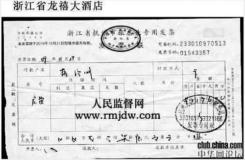 据《今日早报》报道 前天中午,网友“不回帖就耍流氓”在温州一论坛转发了一个帖子,称温州瑞安市委书记蒋珍明,去年11月26日和27日,两天时间在杭州开了3个宾馆房间。帖子还上传了3张发票图片,借此辅证发布内容。 此帖一出,言论四起。前晚7点多,网友“大楼顶部”在温网论坛发了新帖,称事件很快就有调查结果了。 当晚10点左右,“温网论坛”管理员跟帖,公布了事件调处情况。 网友发帖:瑞安市委书记在杭连开3次房? “不回帖就耍流氓”贴出的3张住宿发票图片,都是“杭州市旅店业专用发票”发票联,“付款户名”都写有“蒋珍明”名字。前两张发票“开票日期”是去年11月26日,第3张则是去年11月27日。 3张发票上盖有不同的“发票专用章”,消费金额也不同。 前两张分别是660元和380元,最后一张盖有“杭州龙禧大酒店有限公司发票专用章”的发票,写明“房费”是1176元,付款方式“卡”。 “不回帖就耍流氓”帖中指出:市委书记是公众人物,需要接受公众监督……应该给公众一个说法。 这个帖子很快引来热议,不少网友称这是“猛料”。也有网友对帖子的真实性提出质疑。 论坛发“预告”:今晚有调查结果 让很多网友感到意外的是,前晚7时多,网友“大楼顶部”在温网论坛,就该事件发出新帖,标题为“今晚有调查结果”。 “大楼顶部”帖中称:今天在一些网络论坛上,出现一个“瑞安市委书记杭州2天开3房”的帖子。帖子里发票的名字跟市委书记名字一模一样,引起了网友的讨论……今天晚上温网论坛会公布对此事的调查结果,具体情况怎么样,大家拭目以待。 当晚10点左右,网名“温网论坛”的论坛管理员,跟帖公布了关于上述事件的调查及处理情况。 跟帖称,近日,网络上有反映瑞安市委书记蒋珍明两天内在杭州开了3个宾馆房间的帖文,根据温州市委领导意见,温州市组成调查组对有关问题进行了调查核实,现将调查及处理情况公布如下: 关于客户名为“蒋珍明”的3张住宿发票问题。 1、省委党校660元发票问题,系2009年11月23日—26日期间,瑞安市委书记蒋珍明参加省委党校举办的县(市、区)委书记培训班,其本人费用由省委组织部结算,其驾驶员李某某同期以其驾驶证登记入住省委党校招待所B2210房并自行承担住宿费用,李某某未经请示,以蒋珍明名义结账费用660元(房价为220元/天)。 2、赞成宾馆380元发票问题,系蒋珍明因11月26日下午杭州市区另有公务活动,需晚上才能回瑞安,驾驶员李某某为保证11月26日晚从杭州回瑞安近5小时安全驾驶的需要,从省委党校新校区(余杭区仓前镇)到市区,于11月26日下午2时许以其驾驶证登记入住杭州赞成宾馆822房,并未经请示以蒋珍明名义结账,费用为380元(房费214,晚餐86元,商场消费80元)。 3、龙禧大酒店1176元发票问题,系11月26日晚9时许大雾封道,无法通过高速公路返回瑞安,蒋珍明及其驾驶员李某某于11月27日0时许返回杭州滨江区,并分别以身份证和驾驶证登记入住杭州市龙禧大酒店,房号分别为1216和1220房,两人共消费1176元(每间房价572元/天),移动通话费两元,方便面消费30元。 随后的“处理意见”为“驾驶员李某某行为违反有关财务规定,责令瑞安市委办公室按差旅费报销有关规定予以纠正,并进行通报批评。 网友:及时回应“值得表扬”