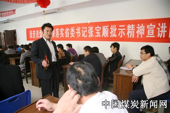 做为集团公司最大最现代化的矿井——钱营孜矿党委把传达贯彻省委书记张宝顺重要批示精神当做一件重要政治任务来安排,及时在矿长办公会、安全生产例会、中心组学习、政工例会等各种会议上进行专题学习,在广播、电视、网络等开辟专栏进行专题宣传学习,并成立宣讲团,深入到班前会进行传达学习。通过立体的学习宣传大格局,让张宝顺书记重要批示精神在矿区人人尽知,并转化为推进工作上台阶的强大动力,推动钱营孜矿各项工作再上新台阶。图为这个矿宣讲团进基层宣传情景。