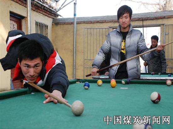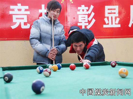 本网讯 近年来,安徽淮北矿业集团工程建设公司朱仙庄矿建项目部车间工会针对工地社区偏僻、职工精神生活单调的实际,加大职工之家的投入,相继建立了职工乒乓球室、职工阅览室和台球室,丰富和满足了职工的业余文化生活,受到了广大职工的欢迎。图为:两名矿工利用下班时间打桌球。