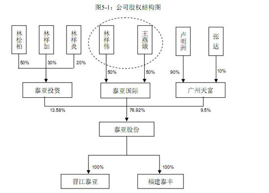 作为泉州地区规模最大的运动鞋鞋底企业,泰亚股份同样也是安踏、特步、361度等鞋底供应商。按照其 泰亚股份招股说明书显示,泰亚股份为典型的林氏家族企业,其中,泰亚国际持有公司5100万股,股东为林祥伟、王燕娥,两夫妇分别持有50%的股权;泰亚投资持有公司900万股,股东则为林祥伟的三个兄弟林松柏、林祥加、林祥炎,持股比例分别为50%、30%、20%。 按理来说,家族企业绝对控股毫无疑问,但同时另外一个外部股东的声影却颇引为关注,而正是这个声影将泰亚股份带进了这场舆论的漩涡。 招股书显示,泰亚股份第三大股东为广州天富投资有限公司(以下简称“广州天富”),持有泰亚股份9.5%股权,股东为自然人卢明洲和张达,分别持股90%、10%。仅按泰亚鞋业上市时22元的发行价计算,其大股东卢明洲身家已过亿。 让外界颇为不解的是,这家原本做混凝土的公司,在2009年8月泰亚股份刚刚完成股份制改造后的2个月,就迅速华丽转身为投资公司,并在更名为投资公司之后不到15天就火线向泰亚股份增资,从获得同意增资到入股完成总共用了短短4天时间,最后以平均每股成本2元的价格获得泰亚股份630万股。 如此精准时点及高效的速度,被此前媒体喻为其火线入股速度可“载入中国创投史”,而同时因入股的成本较低再加上广州天富本身并无雄厚背景,市场怀疑其或为影子公司,即背后或代持他人股份,其间有不可告人之利益输送。 于是,关于广州天富火线入股的故事也成为泰亚股份广受关注的原因,这场起于广州天富的舆论漩涡围着泰亚股份越来越大。