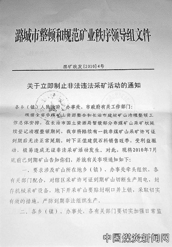 国土局:采石厂手续已过期 11月11日16时许,记者来到潞城市国土资源局。国土局楼下的保安拦住了记者,并声称领导都不在。经过交涉,记者见到了国土局办公室李主任。当记者向李主任了解余庄新兴白云石厂的情况时,李主任告诉记者,这个事情归矿管股负责,让记者与矿管股股长张伟东联系。 根据李主任提供的电话号码,记者拨通了张伟东的手机,记者说明来意后,张股长告诉记者,他正在乡下检查,信号不好,有事发短信说。记者用短信告知其想了解关于余庄新兴白云石厂的手续情况,张股长许久没有回音。一直到19时30分,张回电告诉记者:“余庄新兴白云石厂手续早已到期”。 11月12日上午9时许,记者再次来到潞城市国土资源局采访。记者拨通了矿管股张伟东股长的电话,张称其在外地,安排矿管股的郭永庆(音)接受记者的采访。郭永庆递给记者一份潞城市合室乡余庄新兴白云石厂的采矿许可证副本复印件。记者在采矿许可证上看到:该企业的有效期限至2010年4月27日。不过,当记者想了解更多情况时,郭告诉记者去找办公室咨询…… 在国土局办公室,前一天见到的李主任告诉记者,称局里有规定,媒体采访必须去当地宣传部开具介绍信,我们欢迎监督,也接受监督。 记者在潞城市宣传部新闻中心见到了刘建平主任。刘建平主任说:“只要持新闻出版总署记者证的记者,就可以采访,我们这里没有这个规定,也不需要开介绍信……” 14时30分许,记者再次到国土资源局。在办公室李主任的安排下,记者见到了矿管股张伟东股长。 记者:余庄新兴白云石厂采矿许可证4月27日到期后,一直照常生产,国土局采取了怎样的措施? 张伟东:你见生产了吗? 记者:我们有生产时拍摄的视频。 张伟东:这个地方昨天下午我还去了,看见生产的,我当时就向领导汇报了,并安排史所长回国土所组织人员前往检查。 记者:昨天你们是对非煤矿山检查了吗? 张伟东:对,我们从辛安泉走,路过新兴白云石厂时我看见生产了。但我们没进去检查,因为这个厂子这次不在我们检查的范围内。 记者:这个厂子手续到期后,生产这么长时间,国土部门就毫不知情吗? 张伟东:我们每旬检查一次,都是基层国土所查,不过不可能全面覆盖。张股长一面说一面给记者拿出一封2010年5月7日印发的路矿政发〔2010〕3号文件,内容为:“潞城市整顿和规范矿业秩序领导组关于采矿许可证到期的非煤矿山立即停止生产的通知。”通知要求:采矿许可证到期的矿山企业要立即停止一切生产(施工)活动。同时,公安部门要停止供应火工品,加强对非法使用火工品的监管;电力部门要停止生产供电;各乡(镇)、办事处要切实负起第一监管人的责任,加强监管,严防到期矿山非法组织生产;国土资源部门要加强巡查、检查。记者注意到,在通知后附着采矿许可证到期的20家非煤矿山企业名单,第一家就是潞城市余庄新兴白云石厂。