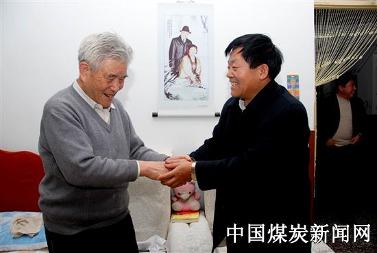 图(2)矿长王冬平(左)亲手递给老领导慰问信和1000元慰问金。