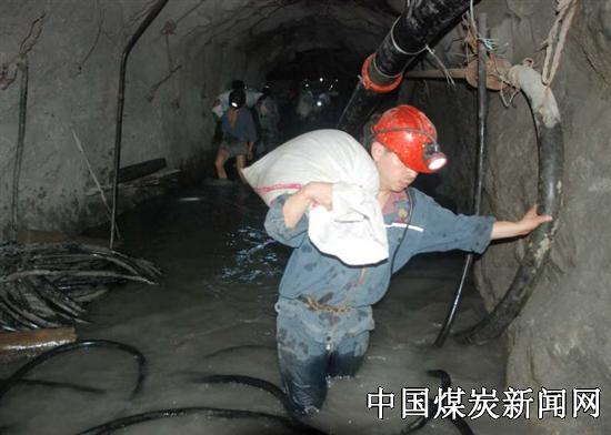 “全力确保中央水泵房的安全,在各个涌水点堆砌挡水墙,阻断漫入水泵房的涌水”,中央水泵房集中了50名干群,搬运大量的沙袋、木条、碹石,在水泵房巷道入口、水仓吸水井周围,四面扎起多道档水墙。抢险队员排成人墙利用水桶把积水往外倒,一拨人累趴下了,另一拨人员又上,轮番上阵与水患争时间,誓保设备完好。机电队员争分夺秒安装潜水泵排除积水,全力以赴确保800千瓦水泵正常运行。在搬运抢险物资过程中,大部分巷道积水齐腰深,队员趟着寒冷刺骨的积水,摸着井巷一步步艰难前行;同时,机电队在0水平井底车场新安装一台160千瓦水泵,由掘进队和通维队协助安装520米长的PV排水管道,把涌水直接排入联络巷道水仓,在主副井联络巷道再安装一台90千瓦水泵,进一步加大排水能力。