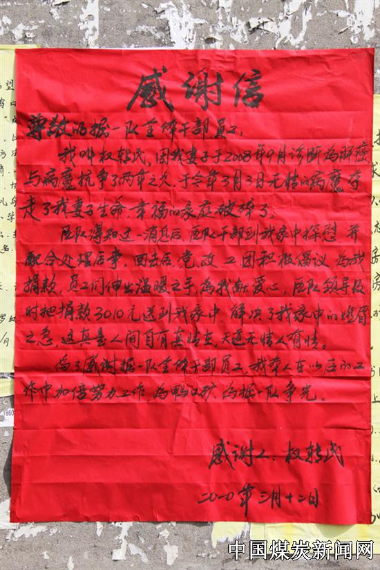 【本网讯】“叮铃铃……”,一阵急促的电话声打破了清晨的寂静。电话的那端传来了噩耗,与病魔抗争两年之久的鸭口煤矿有限责任公司掘进一队员工权转民之妻,被无情的病魔吞噬了她年轻的生命。她走的时候还不到40岁,病魔拆散了原本幸福的家庭,年轻的妻子丢下了老人、丈夫、孩子,撒手人寰带着伤悲离去。 两年前,鸭口公司掘进一队员工权转民之妻不幸换上了肝癌,这对于一个农合工来说意味着什么?突如其来的病魔压得他们喘不过气来,这当头一棒给这个原本幸福的家庭涂了一层厚厚的阴影,何况家里刚盖过新房,花掉了大笔积蓄,为妻子看病更是要花费大量资金,权转民可以说是东借西凑负债累累。 妻子的病要看、借的钱要还,权转民更加珍惜来之不易的工作,他拼命地工作,来维持这个摇摇欲坠的家庭。掘一队领导得知这一情况后,多次委派工会主席吴国贞到其家中探望和慰问,夏收秋种都组织员工帮忙收种,经常询问权转民家中情况,并劝他要保护好自己的身体,时刻注意安全。两年下来,权转民既要上班又要照顾家中病人,整个人黑了、瘦了,可是最终也未能挽回妻子年轻的生命。 在得知权转民妻子去世的情况后,掘一队书记徐行善与主管队长刘成才立即组织领导班子到其家中探望,并从本来就紧张的活动经费中抽出一部分,以解权转民燃眉之急。与此同时,鸭口公司掘进一队党支部、车间工会联合发出倡议书,组织大家少喝一瓶酒、少抽一包烟,伸出温暖之手,献出一片爱心,来帮助权转民渡过难关。人间自有真情在,天道无情人有情,在该区队领导干部的带头下,区队全体员工你一百、我五十、他三十,短短一天内捐款三千多元。当车间工会主席吴国贞把捐款送到权转民手中时,权转民双手紧握住吴国贞的双手再次流出激动的眼泪。并表示在今后的工作中加倍努力工作,为公司和区队争光。 图为感谢信 ![]()