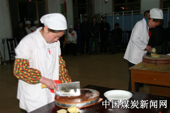 竞技展风采。晚上,员工活动室里笑语欢声。一场厨艺大比拼适时拉开了序幕。生活科女工们现场比赛刀工,土豆做原料,比出速度、质量和数量,激发了女工爱岗敬业的热情。