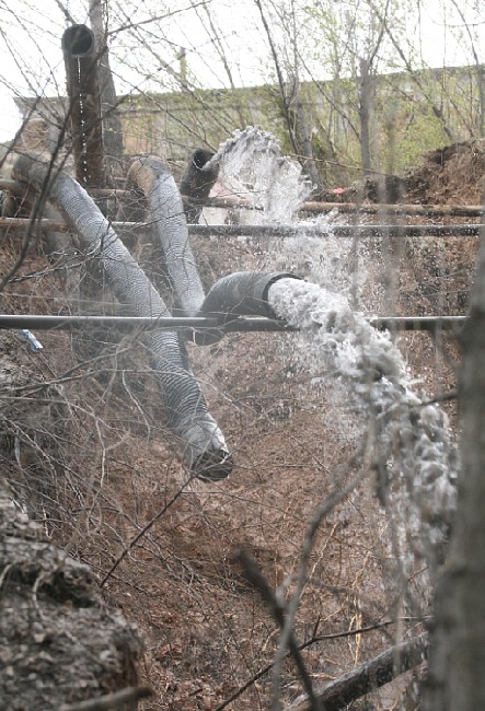 记者现场看到,在矿井东侧和北侧各有两处排水口,矿井东侧有三条输水管,已全部没有排水;北侧排水口有四条口径7寸的输水管,但此时只有两条友黑水流出,而且其中一条只有一半水量。守候在此的工人手持对讲机,每隔10分钟向抢险指挥部报告出水情况,据他介绍,当时的每小时的出水量大约在200-300立方之间。