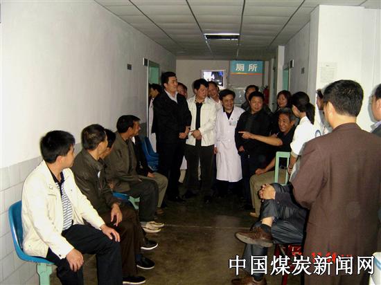 本网讯:5月11日上午,四川省安监局、四川省煤监局局长林书成、煤监局副总工程师鄢正文,川煤集团副总裁、总工程师刘万波、安监局副局长黄承刚一行,在川煤芙蓉公司董事长魏正均引领下来到中国煤矿尘肺病治疗基金会定点医院---川煤集团芙蓉公司总医院(宜宾市矿山急救医院),视察“双肺同期大容量灌洗”治疗尘肺病工作,并看望医护人员和尘肺病职工。