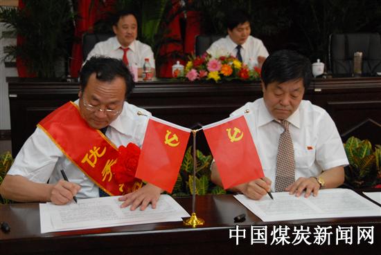 图为矿党委书记祁致祥(左)与基层党组织签订党建工作责任书