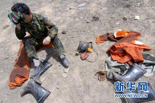 ??? 7月22日,在“7·18”芨芨台子煤矿2号井透水事故救援现场,一名救援人员休息片刻。新华社记者高健钧摄