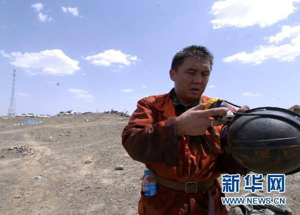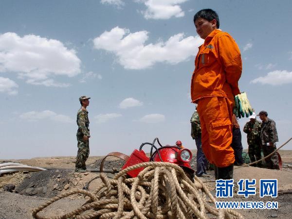 ??? 截至7月23日凌晨1时30分许,甘肃金塔县芨芨台子煤矿透水事故被困人员全部找到,确认全部遇难。 7月18日,甘肃金塔芨芨台子煤矿2号井发生透水事故,13名工人被困井下。事故发生后,甘肃及酒泉当地政府立即组织救援,来自甘肃张掖市矿山救护大队等4支专业救护队的50多名专业搜救人员和400多名协助救援人员在戈壁腹地,冒着生命危险,克服40摄氏度以上的高温等诸多困难,连续进行了6天搜救。新华社记者高健钧摄