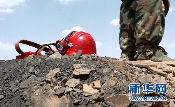 ??? 7月22日,在“7·18”芨芨台子煤矿2号井透水事故救援现场,一名救援人员的安全帽被搁置在瓦砾上。新华社记者高健钧摄