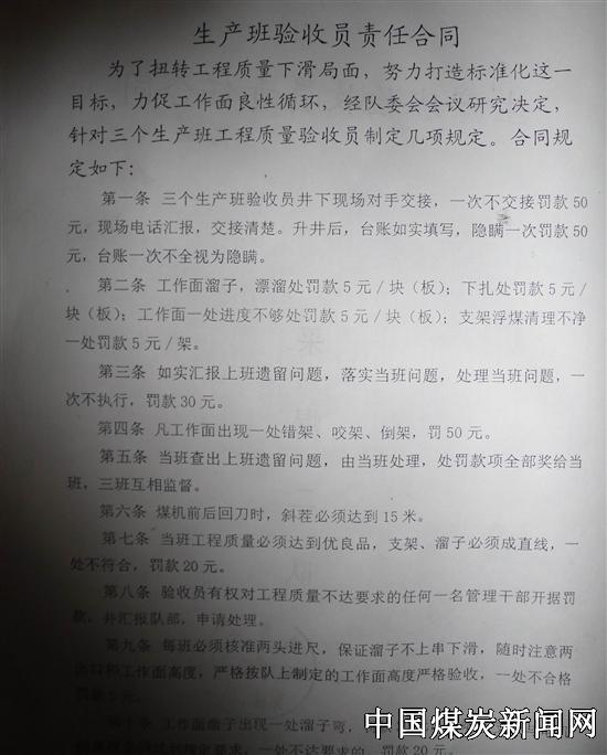 【本网讯】 陕煤韩城矿业桑树坪煤矿采煤区实行八大工种签订岗位责任书管理法,将安全生产目标分解到班组,责任到岗位,月考奖罚兑现,促进了安全生产持续发展。 该队是去年8月首次使用薄煤层采煤机生产的采煤队,为了加强薄煤层机械化生产力量,今年按矿优化组合要求,由原采煤二队、采煤三队合并成立为薄煤层综采采煤区。针对人员多、工种杂、安装拆除、调试生产、推进工作头绪多的特点,该队从细化内部管理入手,在充实完善管理制度的基础上,加大劳动组织管理力度,修订岗位工种安全生产责任书,将岗位细化为采煤司机、油泵工、机电修理工、支架工、质量验收员、班组长、带班副队长八大工种工作目标责任区,明确岗位目标,任务分解到岗位,安全生产责任到个人,区队分别与全队362人签订了责任书,并以责任书条款落实情况、岗位贡献大小、工作绩效优劣综合考评,将岗位工个人月考核结果纳入当月工资奖金分配一项内容,奖优罚劣。从而增强了职工岗位安全生产责任意识,促进了安全生产发展,提高了工作效益和生产率效。
