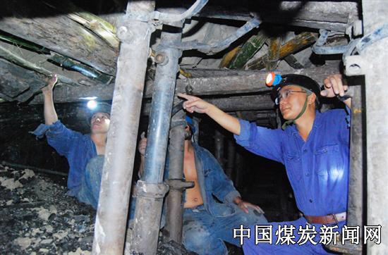 图为矿长曾家慧在井下采面指导职工进行背顶