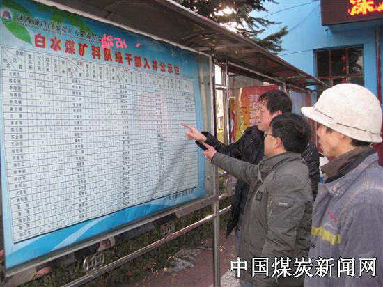 图为:职工在领导干部下井公示栏前观看下井带班情况