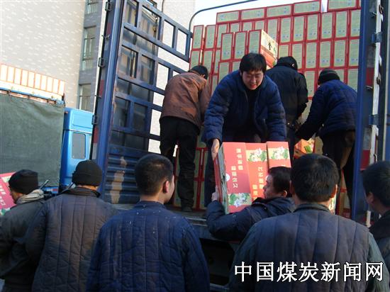 春节临近,山东淄矿集团公司许厂煤矿为职工们发放了海都食品、食用油、春秋被等年货,让职工过一个欢乐祥和的春节。图为工作人员为职工发放过年物资。