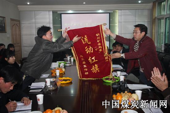 下图为公司宣传部副部长席选民(右)为该矿颁发流动红旗