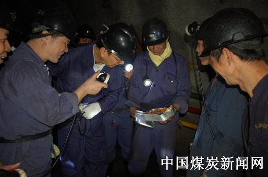 短暂的工作汇报之后,董事长、总裁覃道雄在该矿矿长周向志、矿党委书记肖科生等矿领导的陪同下井,当下到副井底时,首先向节日期间坚守工作岗位的信号工问好,在-600的22110综采工作面,董事长、总裁覃道雄边走边看,对该矿安全质量标准化工作的创新做法赞不绝口。当遇到正在加班的工人师傅们时,覃总停下了脚步,与他们亲切握手,并祝节日愉快,询问他们综采工作辛不辛苦,有什么建议,临走还与他们合影留念。