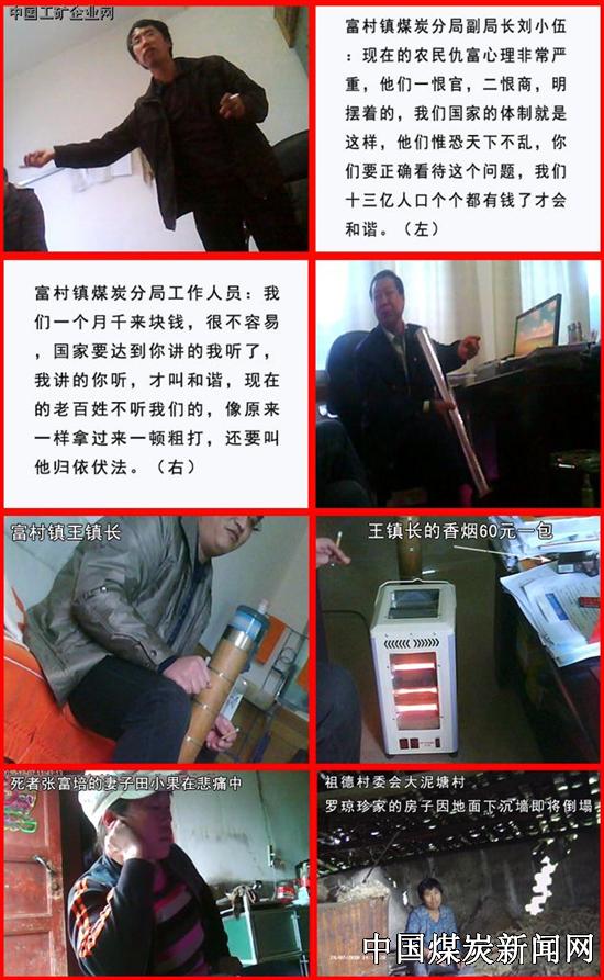 2010年12月6日下午,我们来到富村镇煤炭分局,该局副局长刘小伍说富村辖区内的煤矿这些年安全搞得很好,从未发生过任何大小安全事故。我们向他介绍了相关的调查情况后,他问我们是谁举报的,我们说是当地老百姓。接下来的一段话令人非常惊讶,他说:“现在的农民仇富心理非常严重,他们一恨官,二恨商,明摆着的,我们国家的体制就是这样,他们惟恐天下不乱,你们要正确看待这个问题,我们十三亿人口个个都有钱才会和谐,有的老百姓讨不着媳妇还跑到政府那里叫政府给他讨个媳妇。”这时,坐他对面另一个工作人员抱着水烟筒指手画脚的补充说:“我们一个月千来块钱,很不容易,国家要达到你讲的我听,我讲的你听,才叫和谐,现在的老百姓不听我们的,像原来一样拿过来一顿粗打,还要叫他归依伏法……”。
