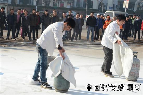![]() 图为五味道场(饭店)员工进行液化气罐火灾扑救表演