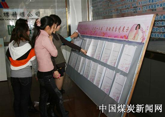 攀煤精煤分公司工会在全公司500余名女职工中开展了“同读一本书”活动,通过读书学习,广大女职工纷纷写出读书心得,参加好心得交流评比。该公司通过评选,将优秀心得纺织醒目位置进行展示。(图为职工正在观看读书心得)