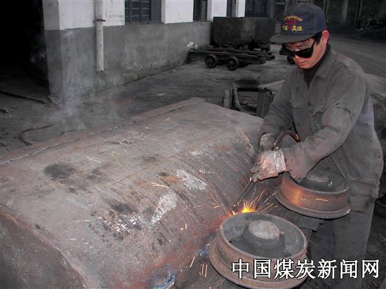 图为杨晓东在焊补矿车。(杨涛、杨述珍/摄)