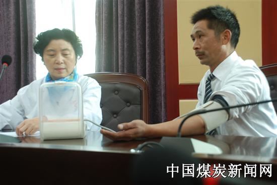 近日,郑州市职业病防治所受郑州市政府和卫生局委托,前往巩义瑶岭煤业有限公司,为46名尘肺病患者做了健康调查和慰问,为每人赠送了一个健康礼袋。图为职防所医生为尘肺病职工量血压。