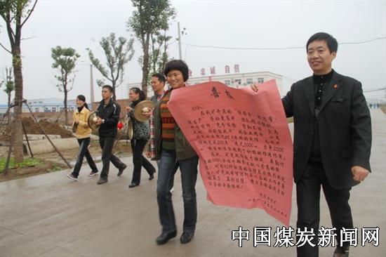 本网讯 11月7日,皖北煤电集团公司朱集西煤矿相关部门负责人及工作人员敲锣打鼓来到该矿101掘进队,为他们送去了喜报和奖金,以表彰他们在-962水平轨道石门工程施工中的作出的优异成绩。