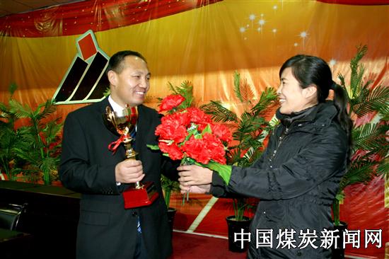12月14日,大峰露天煤矿采煤二队生产一班喜获全矿班组建设第一名,工长吴新东手握工人先锋号流动奖杯,十分激动。今年以来,他们班狠抓安全不放松,1-11月份连个碰手碰脚的现象都没有。按照质量标准化的要求认真完成队里下达的生产任务,月月工程质量上等级,成为标杆班组。图为媳妇展新佐从山下专程赶到颁奖会场,为吴新东深情地献上了花束,为老公奋战四季度鼓劲加油。