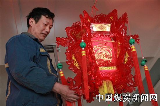 在山西阳煤集团二矿办公楼门前悬挂带着中国结的大红宫灯,一盏盏一串串的红灯笼,红红火火迎新年。