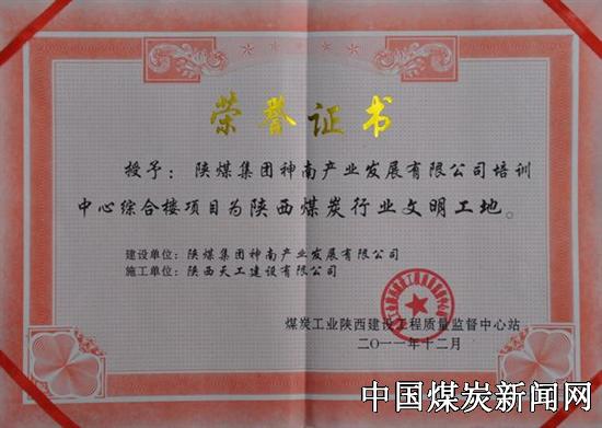 神南产业发展公司培训中心综合楼建设项目获“陕西煤炭行业文明工地”称号