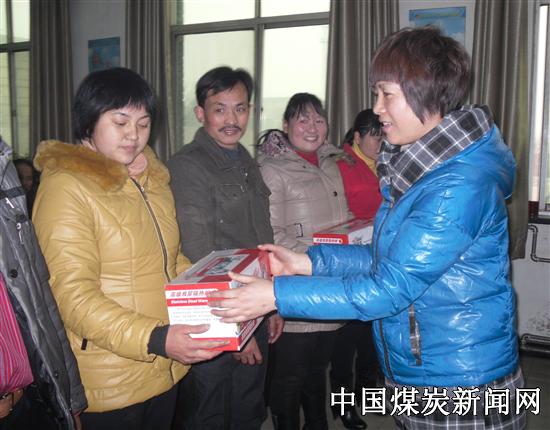 为了加强矿井安全工作,增强井下采煤工、掘进工岗位安全自保意识,共建平安幸福家庭。今年初,陕煤韩城矿业下峪口煤矿工会女工委同1380名采掘工分别签订了“煤矿采掘工夫妻安全联保目标责任书”。大力提倡和引导采掘工夫妻,关注安全、珍惜生命,个个共建平安幸福家庭,人人争当平安幸福夫妻。经季度考评和年度总评,其中有862对采掘工夫妻实现了责任书规定的目标,被评为2011年度“平安幸福夫妻”, 受到表彰奖励。图为12月29日,该矿工会副主席王芳(右)在班前会给采煤三队五对夫妻颁发奖品一角。