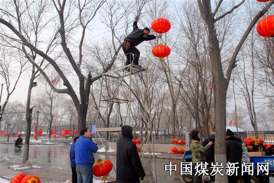 兔年元宵节来临之际,阳煤集团五矿及早动手,在春节过后就组织人员制作机械灯、吊挂灯笼,充分体现元宵节灯展特色。图为阳煤集团五矿基层单位人员正在大井一条街吊挂灯笼。