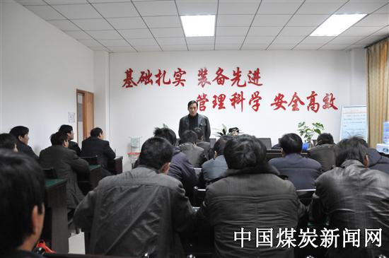 图为综采一队班前会考核职工二十条红线。摄影:冯巨